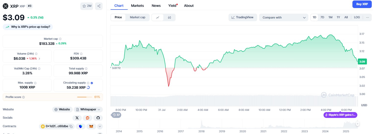 The XRP price is trading in a narrow band after reaching a monthly high of $3.65 earlier in July. It has since declined by nearly 14% to about $3.09, showing only a modest 5% weekly gain.