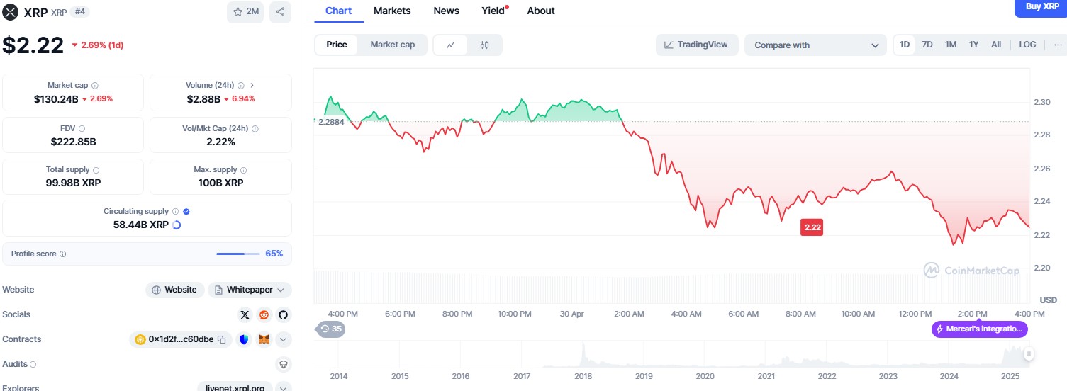 XRP has rallied 8.63% over the past week, trading at $2.22 as of 30 April 2025, according to CoinMarketCap.