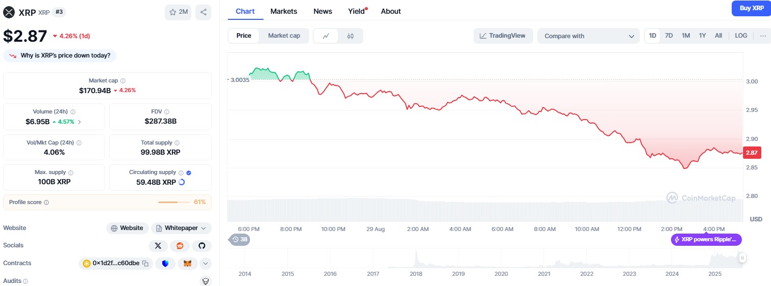 At the time of writing, XRP trades at $2.87, remaining below the $2.95 resistance zone. Market data shows reduced activity from both new and existing participants, leaving the cryptocurrency in a consolidation phase.